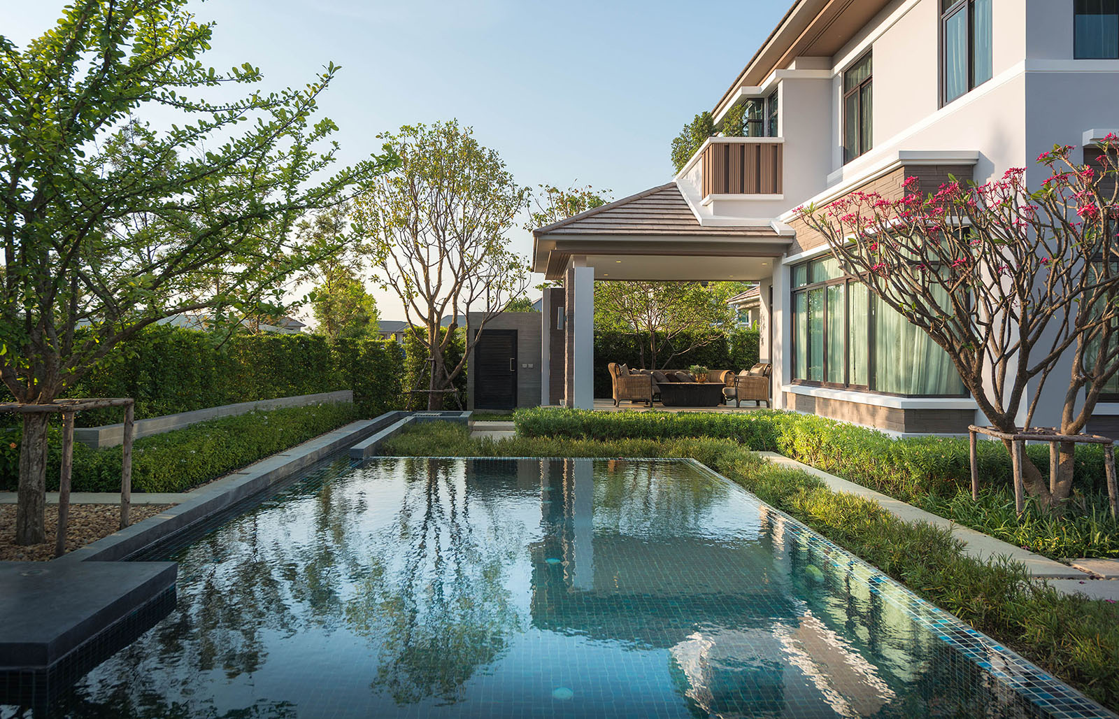 景觀設計時我司專門組織設計是遠赴新加坡游學,深入理解晉合集團開發理念,將新加坡的特別濃郁的度假式的景觀思維與傳統的蘇州園林的文化意蘊相結合,并且在在公共區域之外,別墅庭院采用統一風格韻味下不同的針對性、定制型設計,最后表現出來的即是晉園別墅這種極具具有東方詩意、度假風情的稀缺純墅區景觀。景觀領域的成功,大大增強了別墅本身的價值,也是后來墅區受惠于金雞湖版塊之外產生極高溢價的另一重原因。