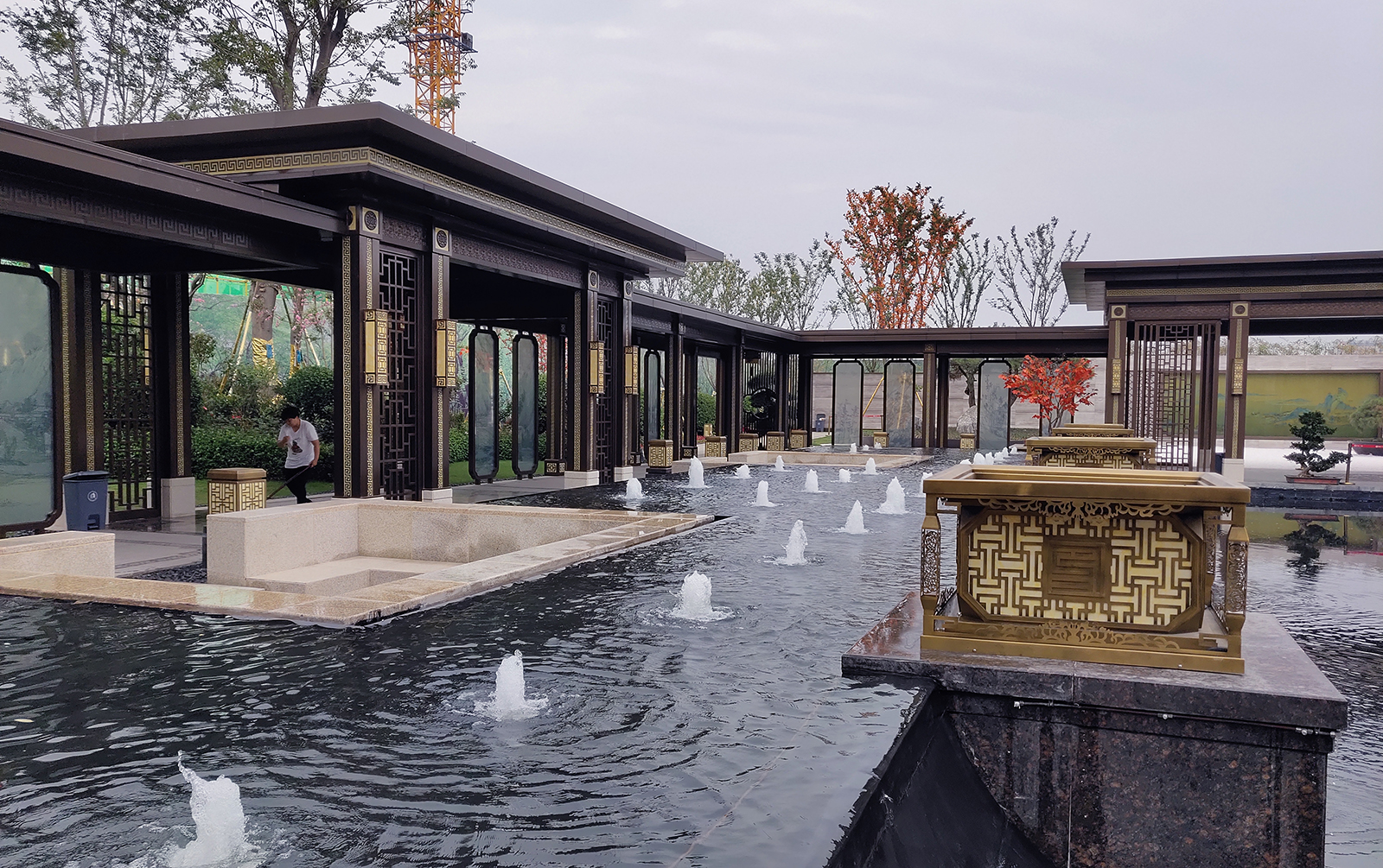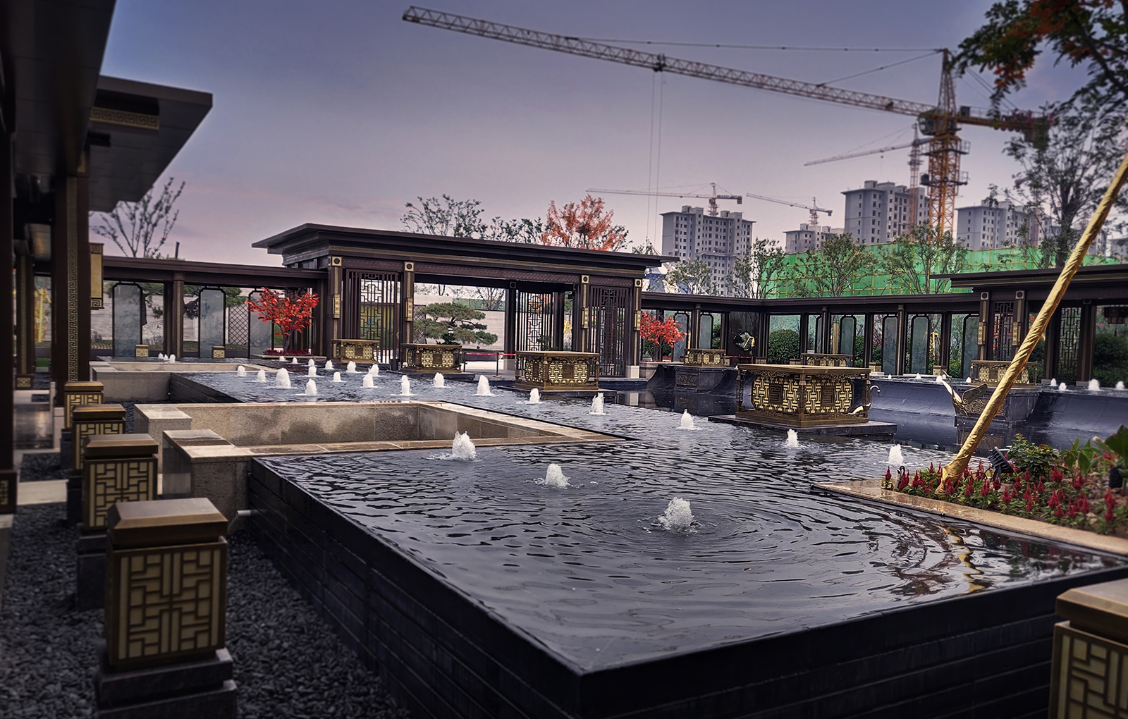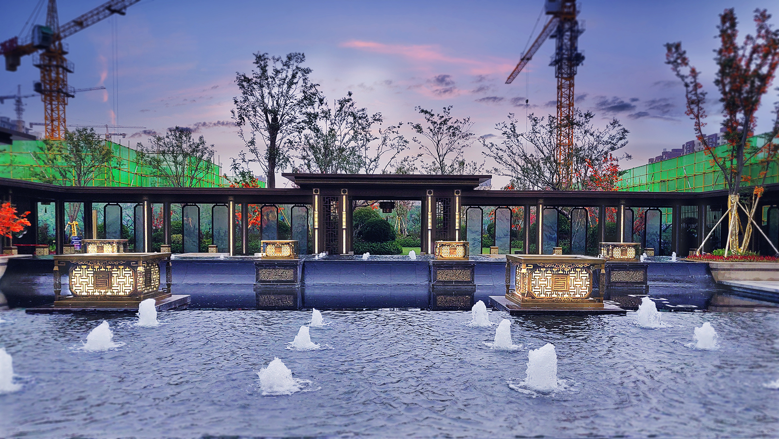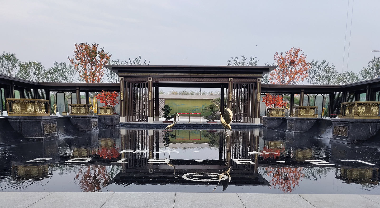 鏡面水景輕靈、優(yōu)雅、致韻;雙排四座宮燈雕琢萬(wàn)字符,寓意前程萬(wàn)福。