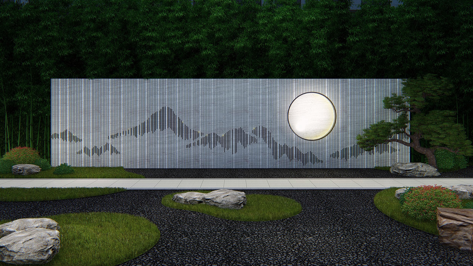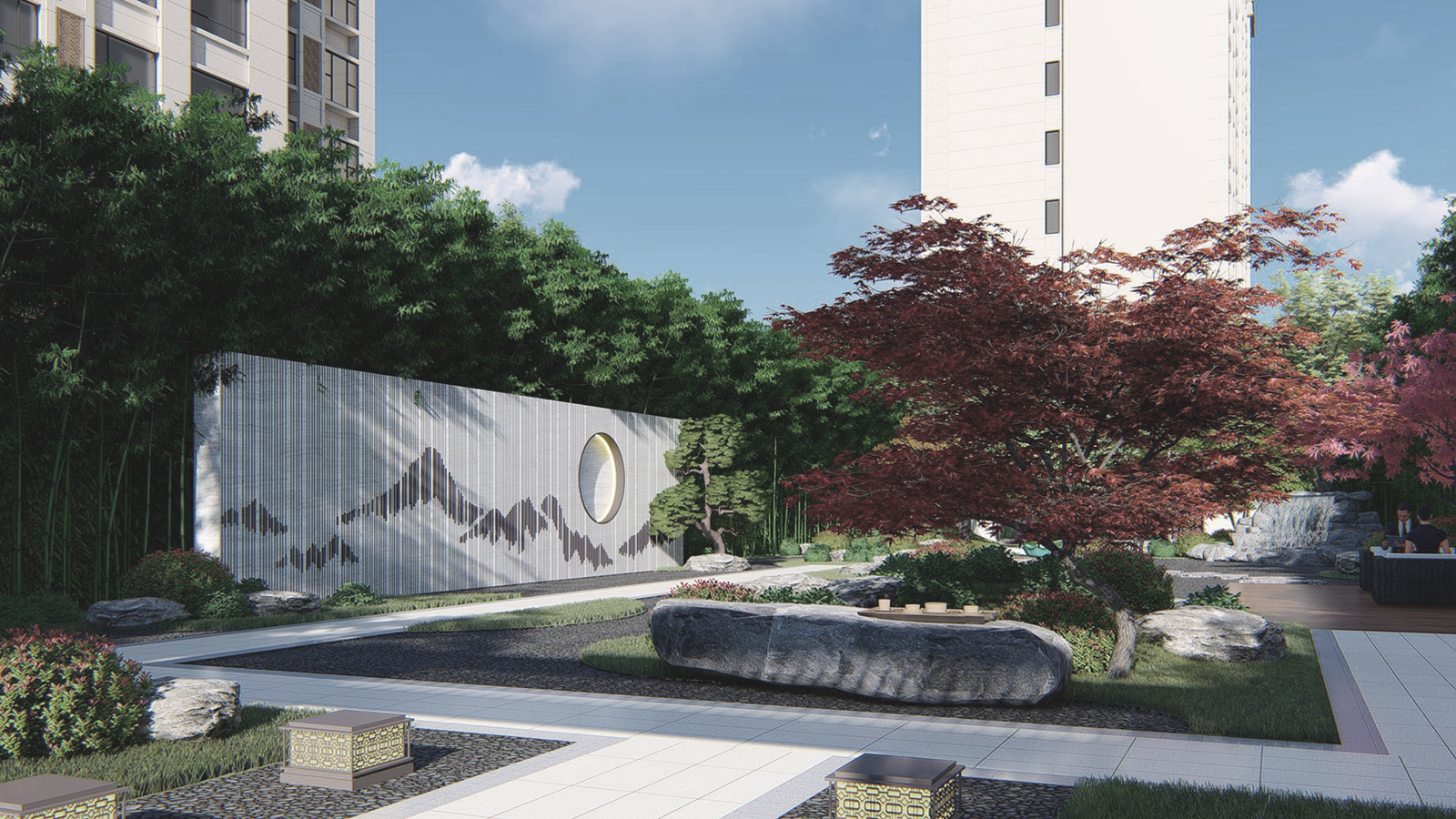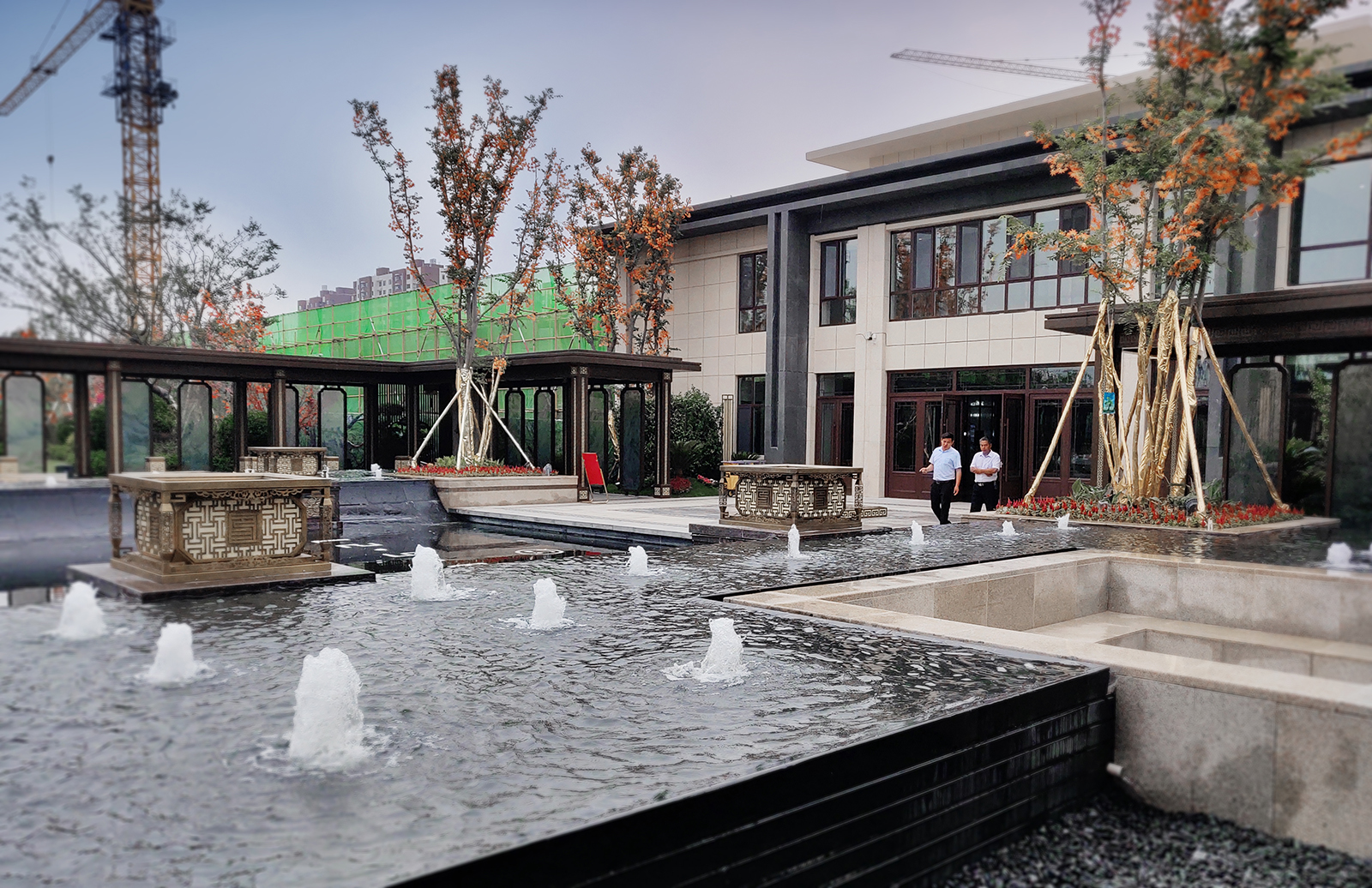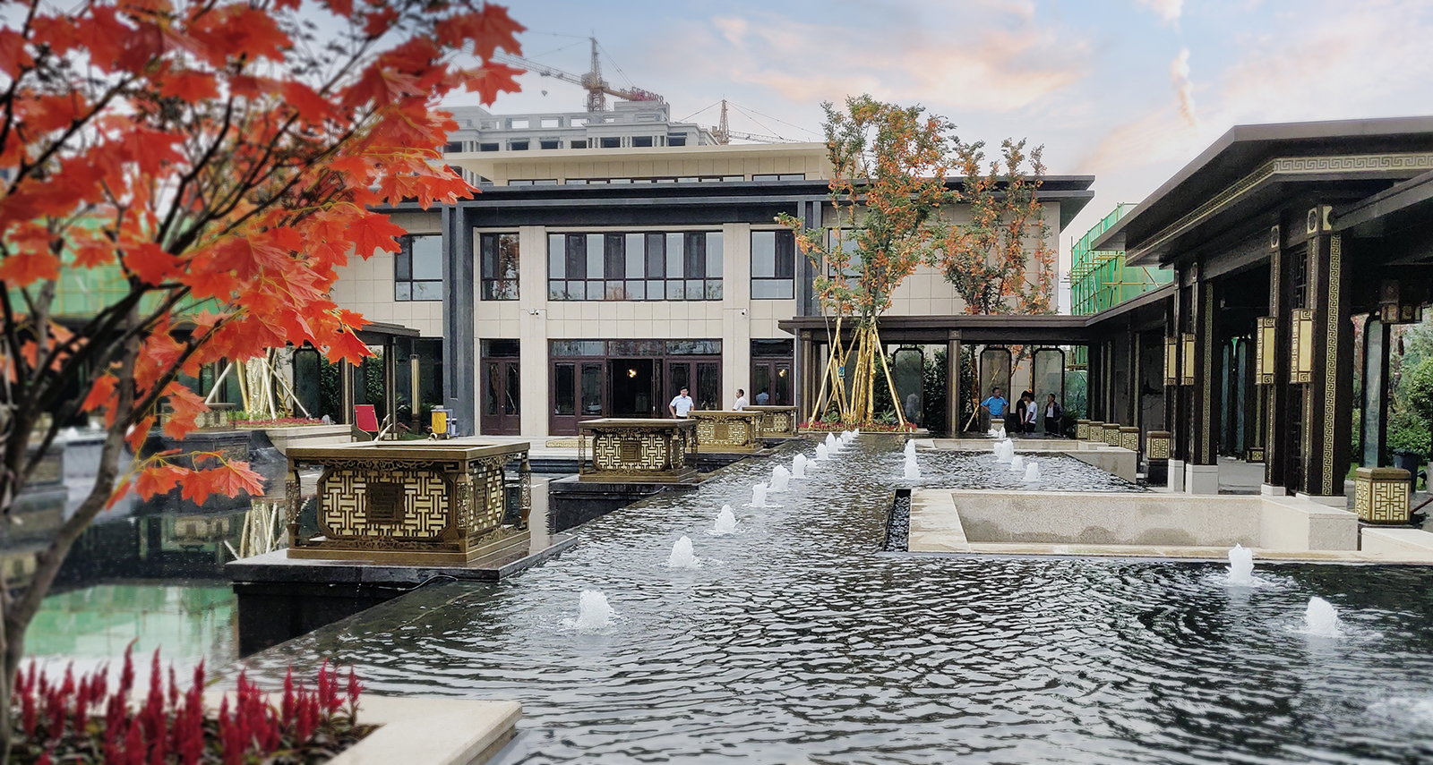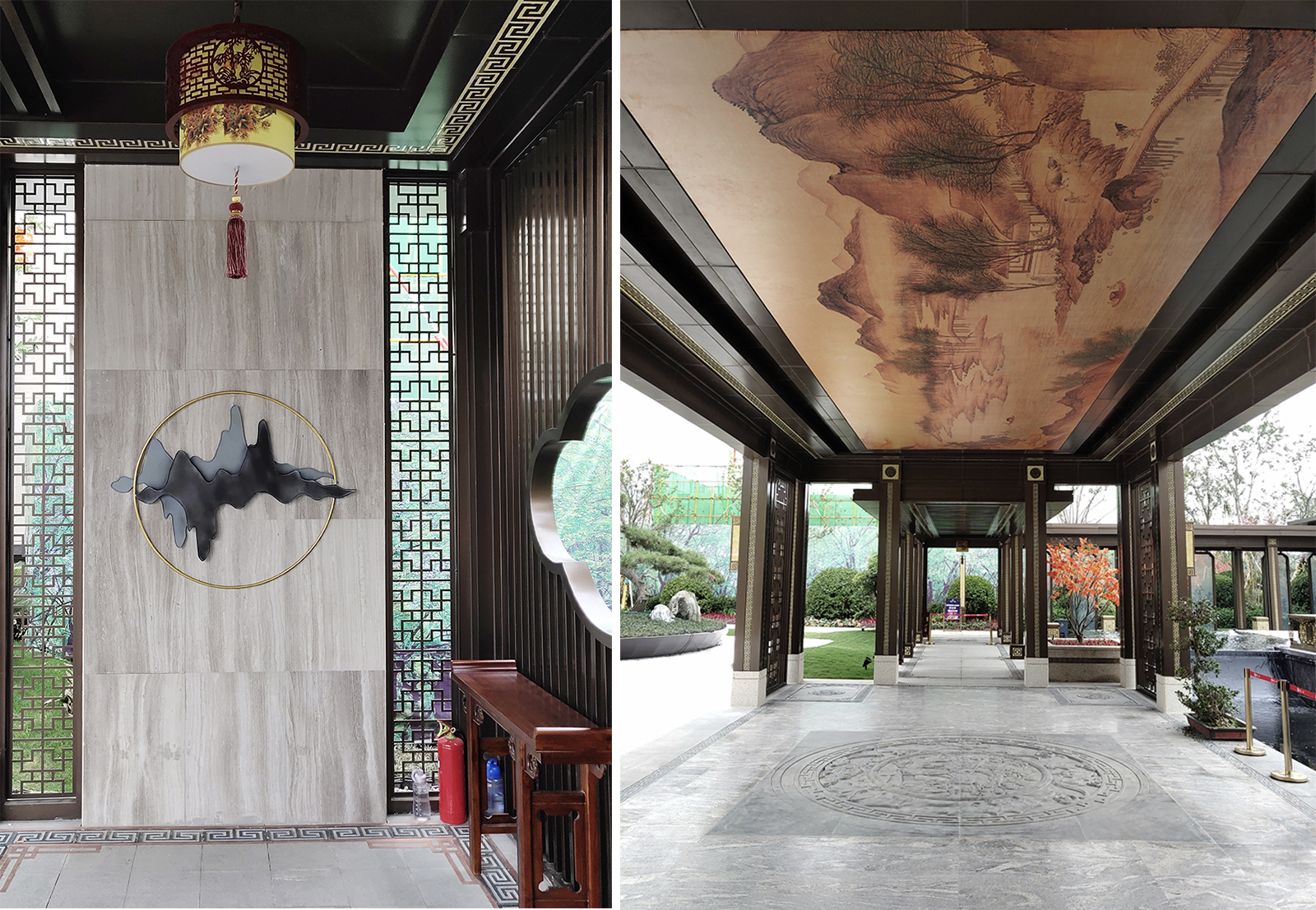 鏡面水景輕靈、優(yōu)雅、致韻;雙排四座宮燈雕琢萬(wàn)字符,寓意前程萬(wàn)福。
