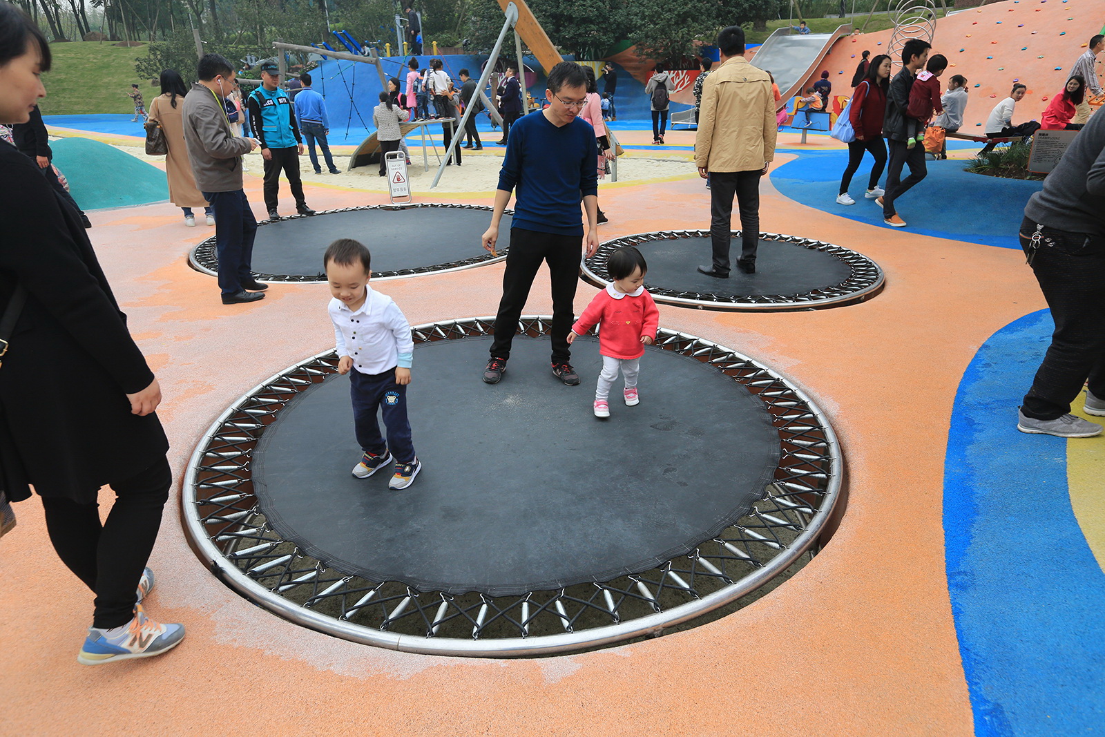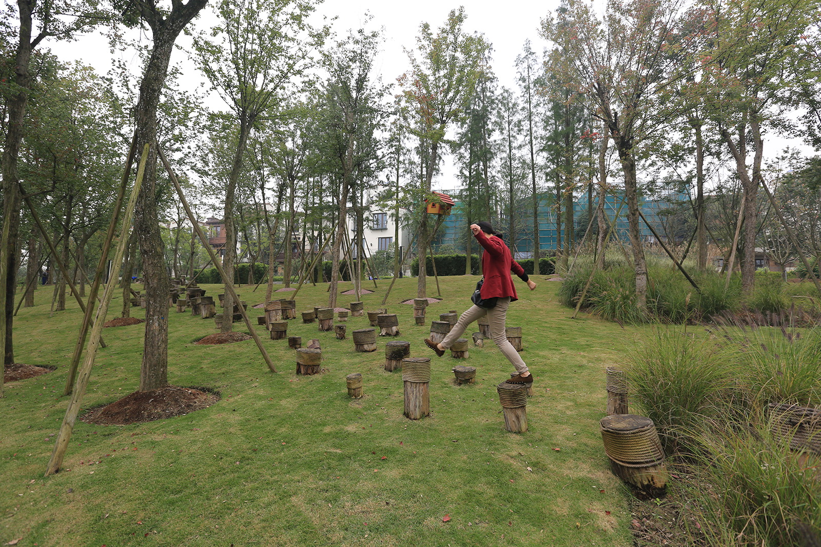 以學齡大童冒險為設計主題,架空的冒險管道、吊橋、方盒子滑梯等設計,激發兒童的探索欲、合作精神、冒險精神。拓展兒童的空間想象力。同時林蔭大樹與器械相結合,探險空間猶如穿梭、浮空在林中,兒童伸手能觸碰到大樹的枝條,更加增強了兒童與自然的互動。