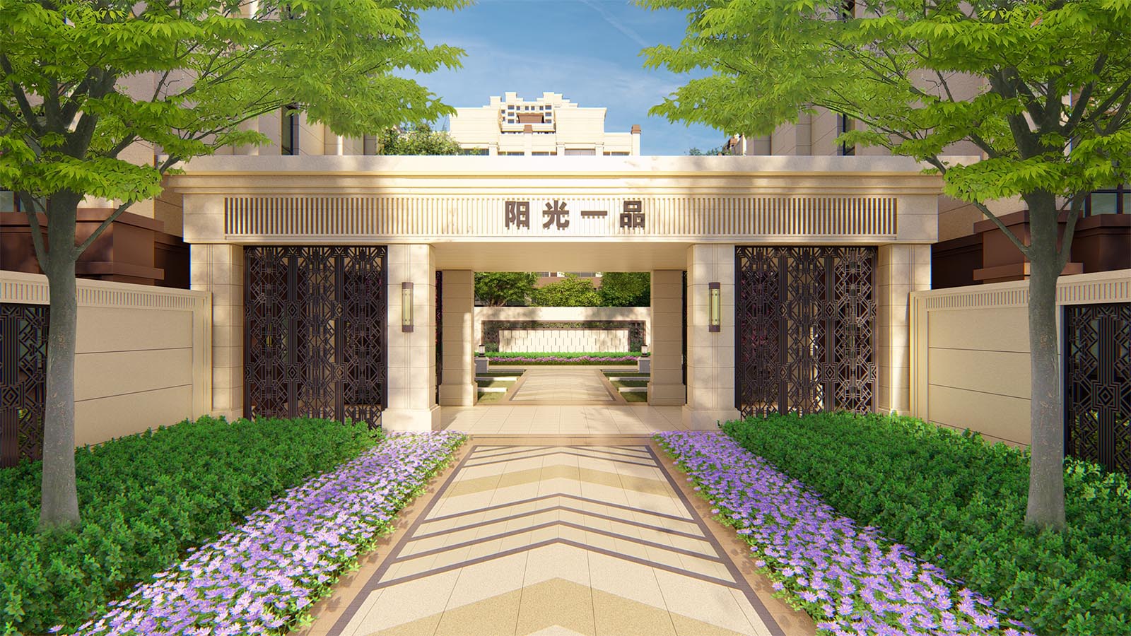 “迎光”主題雕塑概念源于“陽光一品”案名,通過具有張力的具有射線感的紫銅質感的雕塑形態,將迎接業主歸家進入陽光一品的主題借此闡述。
