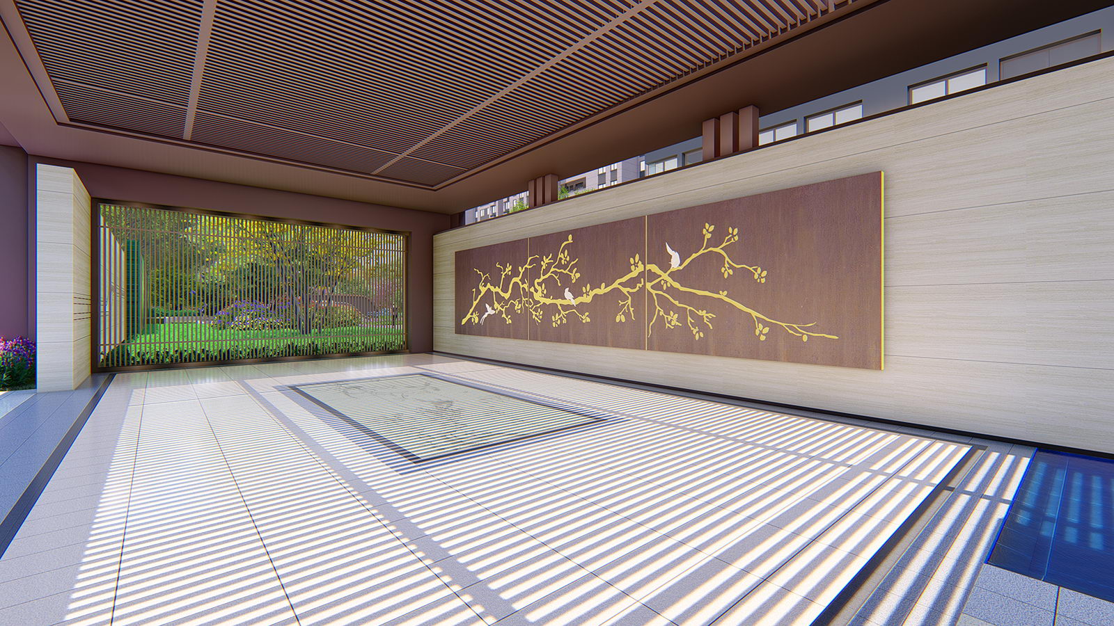 門頭對景處設置“喜上眉(梅)梢”景墻,客戶視線跟隨梅花枝條方向延伸,巧妙構建空間遞進關系,為項目增添趣味及內涵。