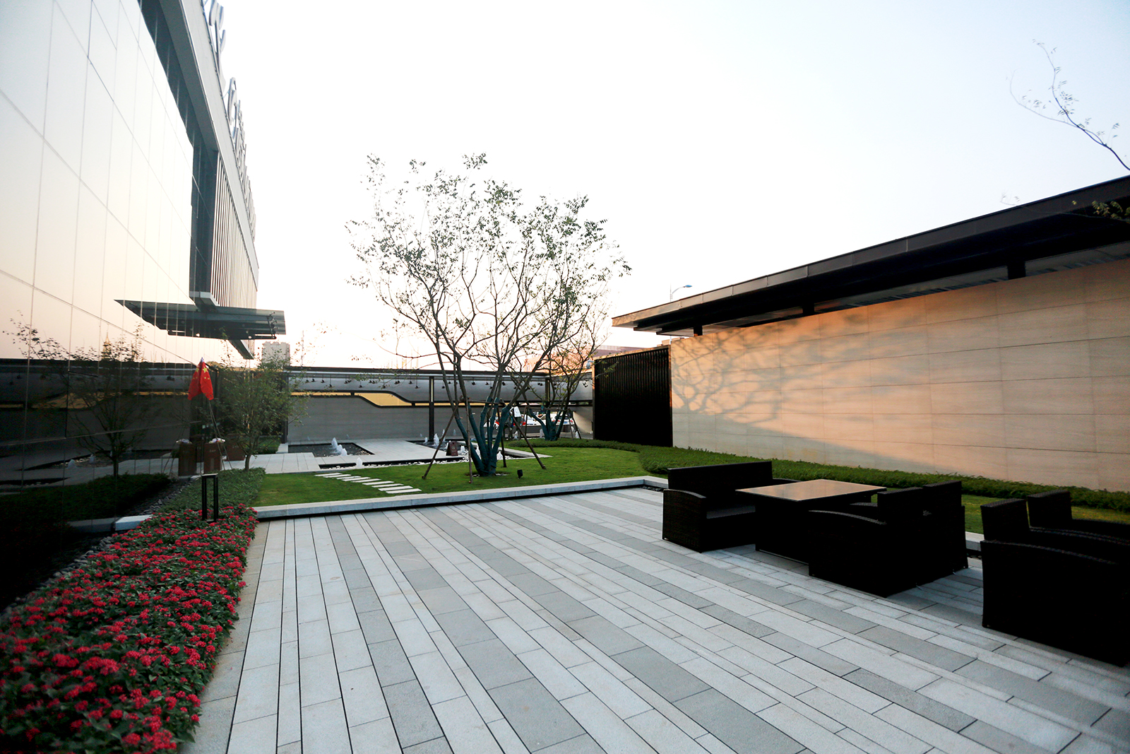 置業顧問引導客戶到達休閑平臺,空間開闊,綠植分布周圍,對景草階現代新穎,草坪上散布的藝術裝置增添景觀亮點,為客戶創造心曠神怡的身心感受,品味整個示范區的優雅品質。