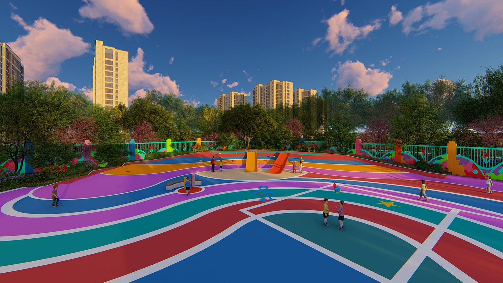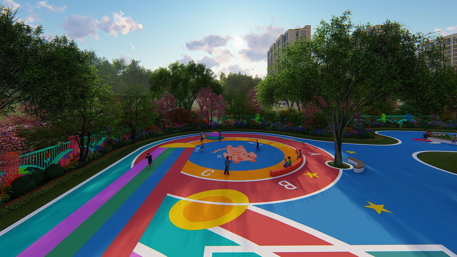 七彩童夢幼兒園主要包含“分班教學、寶玩英語、七彩跑道、戶外拓展、萌娃創客”五個活動區,以彩虹為景觀設計肌理,貫穿整個幼兒園,為蒙學兒童創造高水平早教兒童樂園,從孩子的視角出發,引導、啟發兒童智力發展,拓展孩子的想象力、動手能力及學習能力。