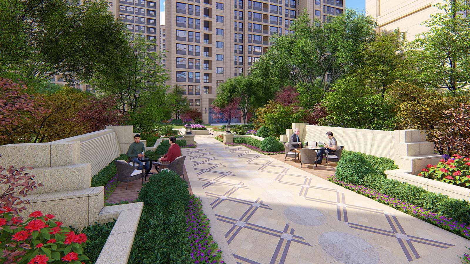 老人休閑組團包含太極健身區、棋牌娛樂區、靜養休閑區三大主題空間,區塊設置在最為安靜雅逸的地塊北區,太極健身區在太極健身廣場設計太極點位,方便老人展開太極運動,通過對于淄博當地生活習慣的深度調研,特別設計了棋牌娛樂空間,方便鄰里間在茶語飯后休閑時間,切磋棋牌游戲,將具有療養養生的性質的香花植物,開花喬木在區塊布置,提升老人的樂觀精神與生活活力,給老人創造一個極悠然、祥和、安寧的休憩、養生生活空間。