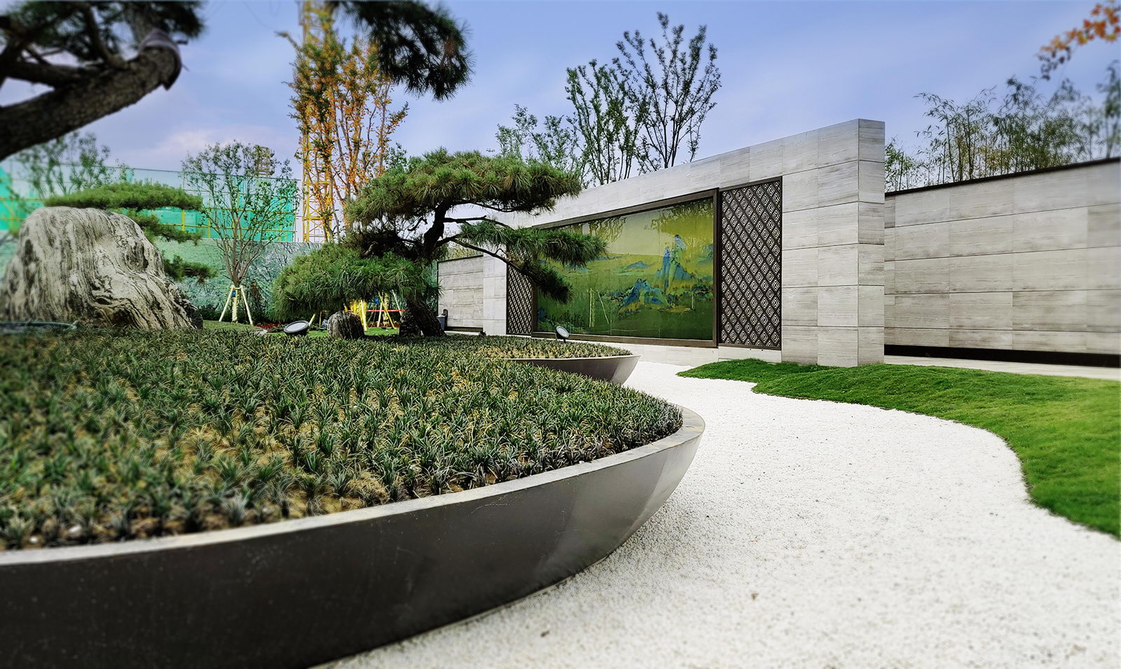 鏡面水景輕靈、優雅、致韻;雙排四座宮燈雕琢萬字符,寓意前程萬福。